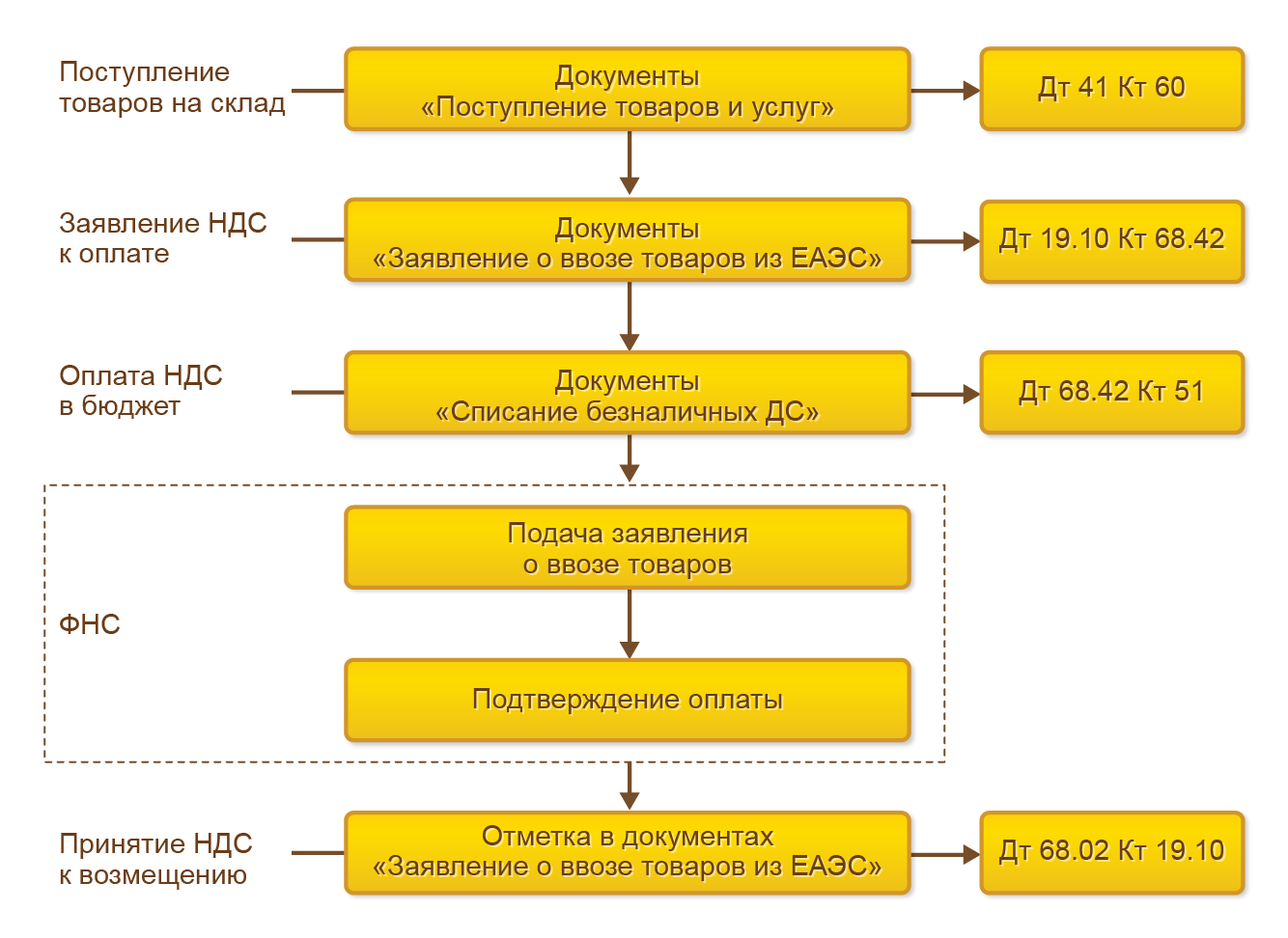 Также поддерживается учет НДС при импорте из стран Евразийского экономического союза. Регламент оформления импорта товаров из стран ЕАЭС представлен на схеме: