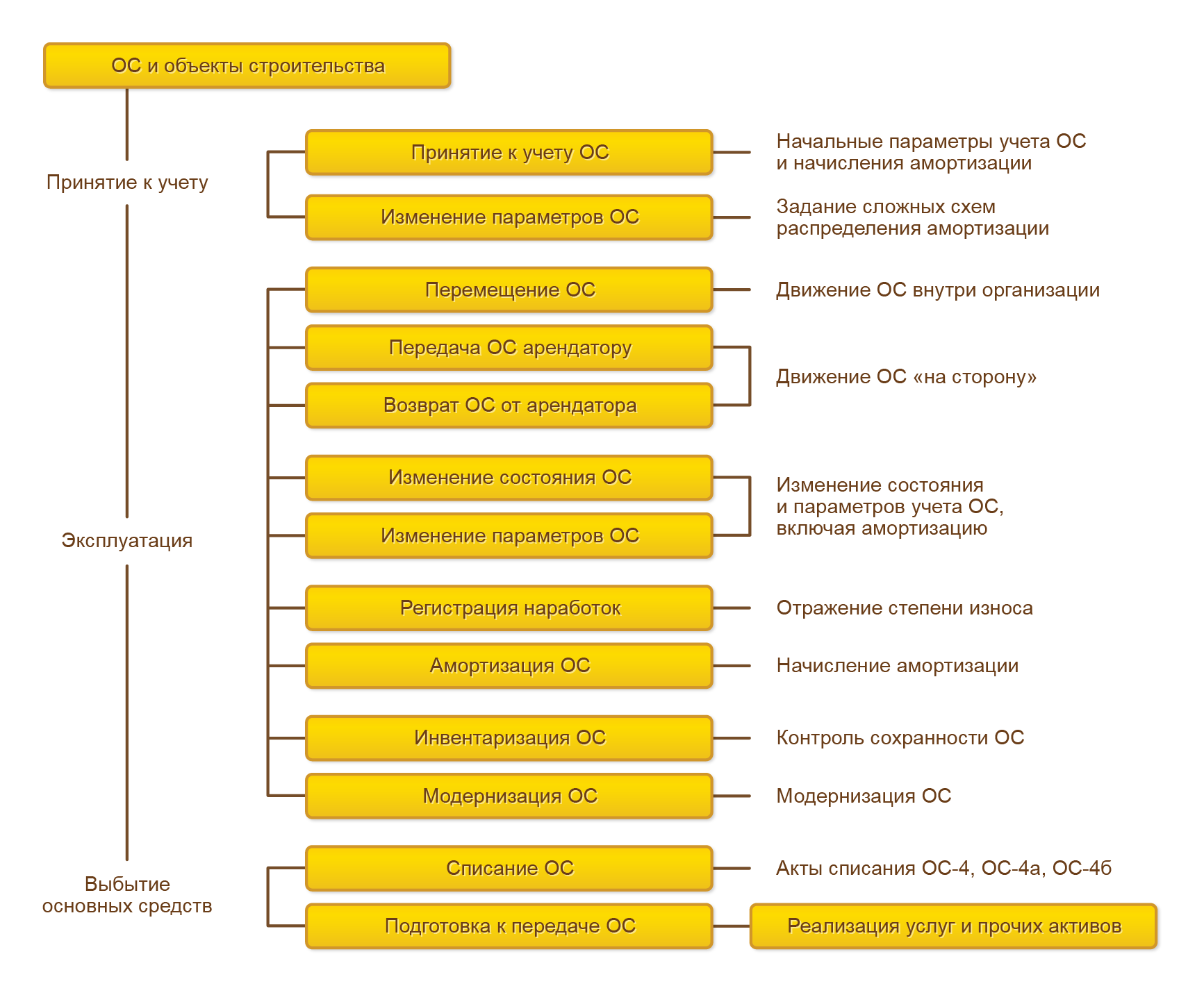 Общая схема документооборота, отражающая движение основных средств с момента ввода в эксплуатацию до выбытия, представлена на следующей схеме: